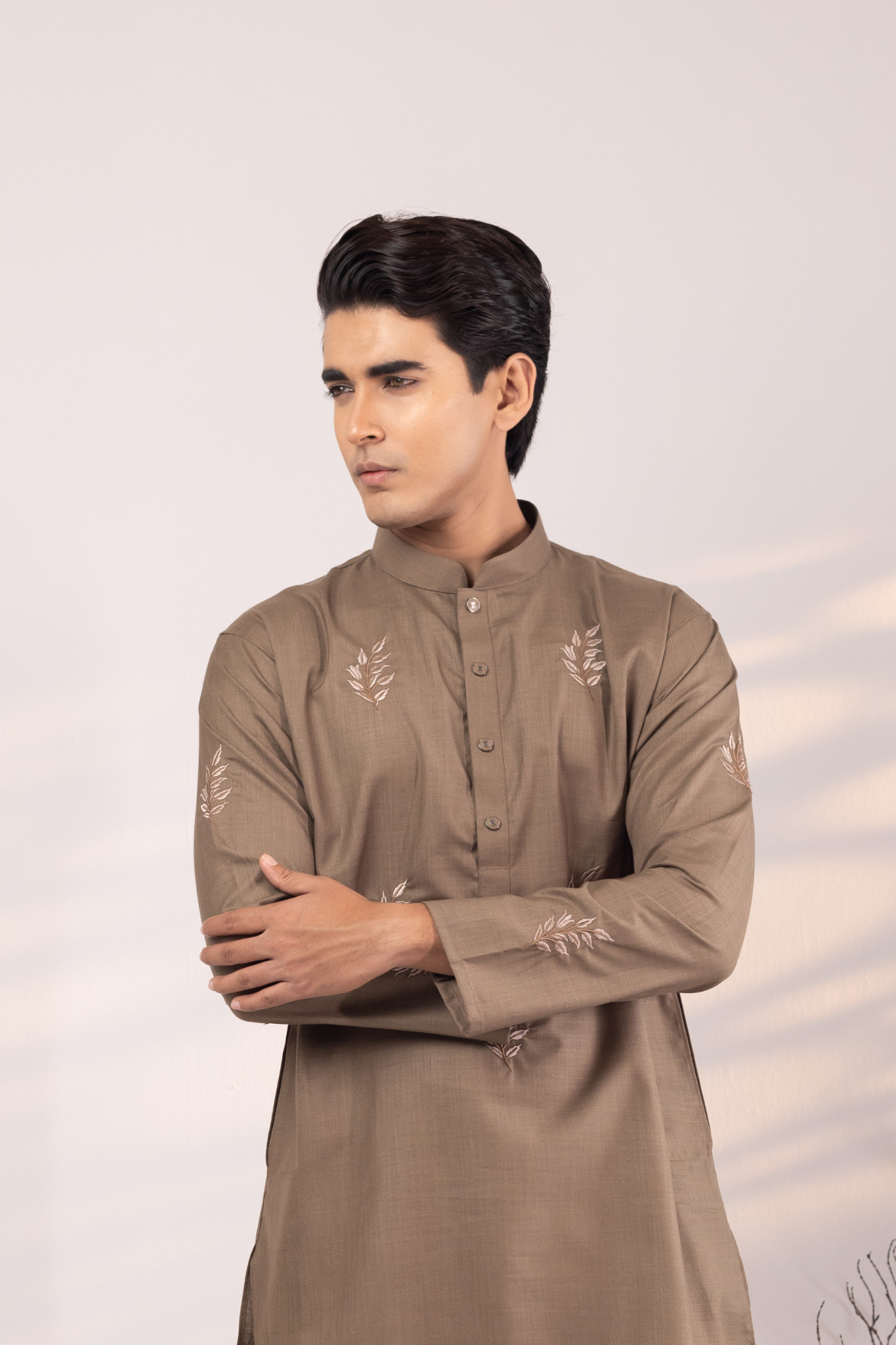 A breath of fresh air, this sky blue Panjabi features a subtle sheen and delicate leaf-motif embroidery on the collar and cuffs, blending modern minimalism with traditional craftsmanship.